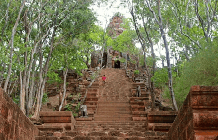 Phnom Sar Sear, Kep City is a nature and cultural site located about 14 Kilometers southwest of Kep city. this mountain is called Phnom Sar Sear because, according to Khmer legend mentioned above, when Prince Sakor Reach led the troops to this place, he got off his horse and moved furtively2 ahead of his pursuers along the mountainside, where at that time there was an island to which he fled. Thus, the mountain was called Phnom Sar Sear.
